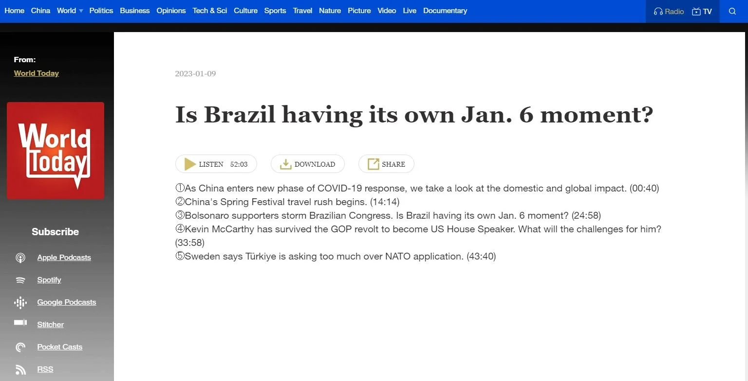 Is Brazil having its own Jan. 6 moment? MediaInterviewLatin AmericaDemocracyProtests 9 Jan Written By Guy Burton CGTN TO LISTEN TO THE INTERVIEW, CLICK HERE. BrazilLula da SilvaJair BolsonaroElectionsProtest Guy Burton