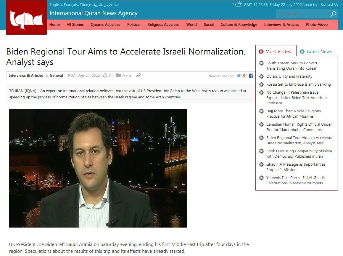 Dr. Burton's research interests are wide ranging. He covers comparative politics, international relations, the politics of development and public policy and has regional specialism in the Middle East and Latin American areas. Following his interview with IQNA about Joe Biden`s trip to the Middle East and its effects on the reign and US.
