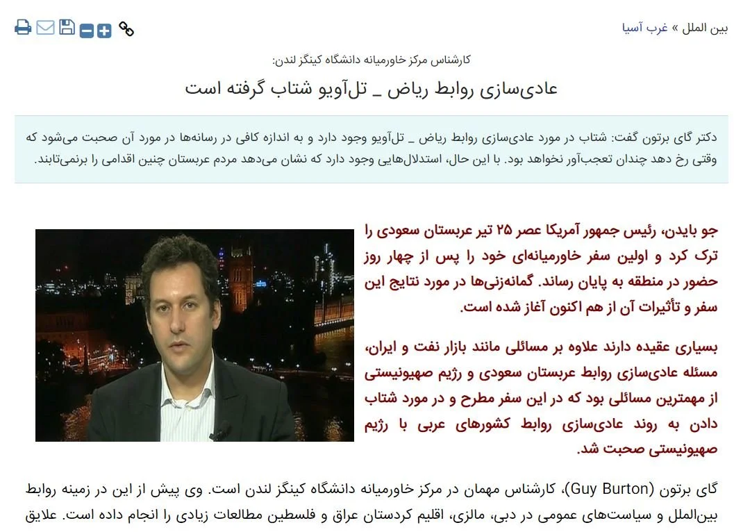 Guy Burton is a visiting scholar at the Middle East Center at King's University London. He has previously conducted many studies in the field of international relations and public policies in Dubai, Malaysia, Kurdistan Region of Iraq and Palestine. His research interests include the role of emerging powers in the multipolar world centered on the Middle East. IKNA's interview with this expert on Middle East issues continues about this trip and its results.]